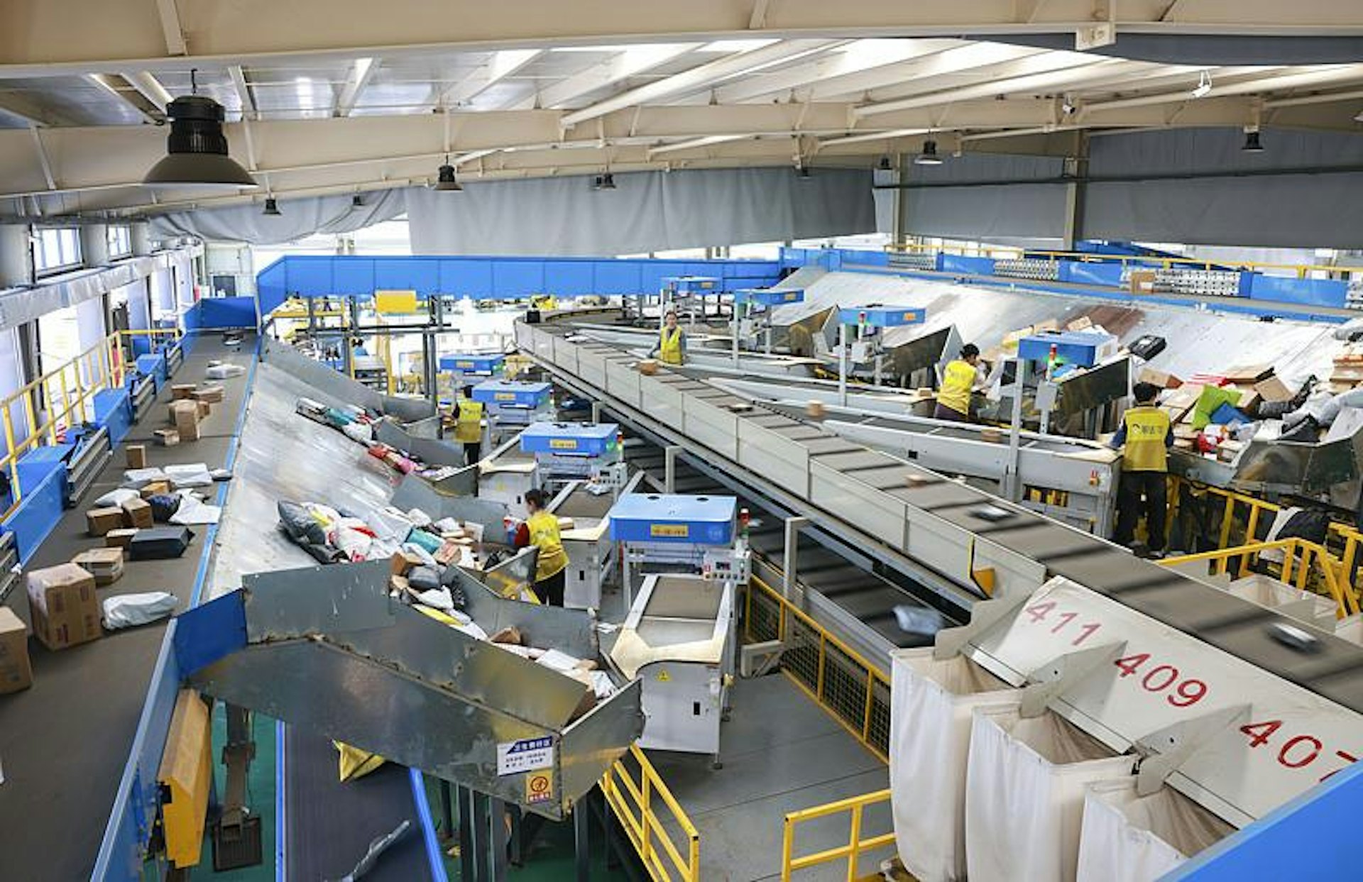 2025年11月11日,山東東營,廣饒縣快遞集中配送中心的工作人員正在對快遞包裹進行掃碼分揀。(CFP)