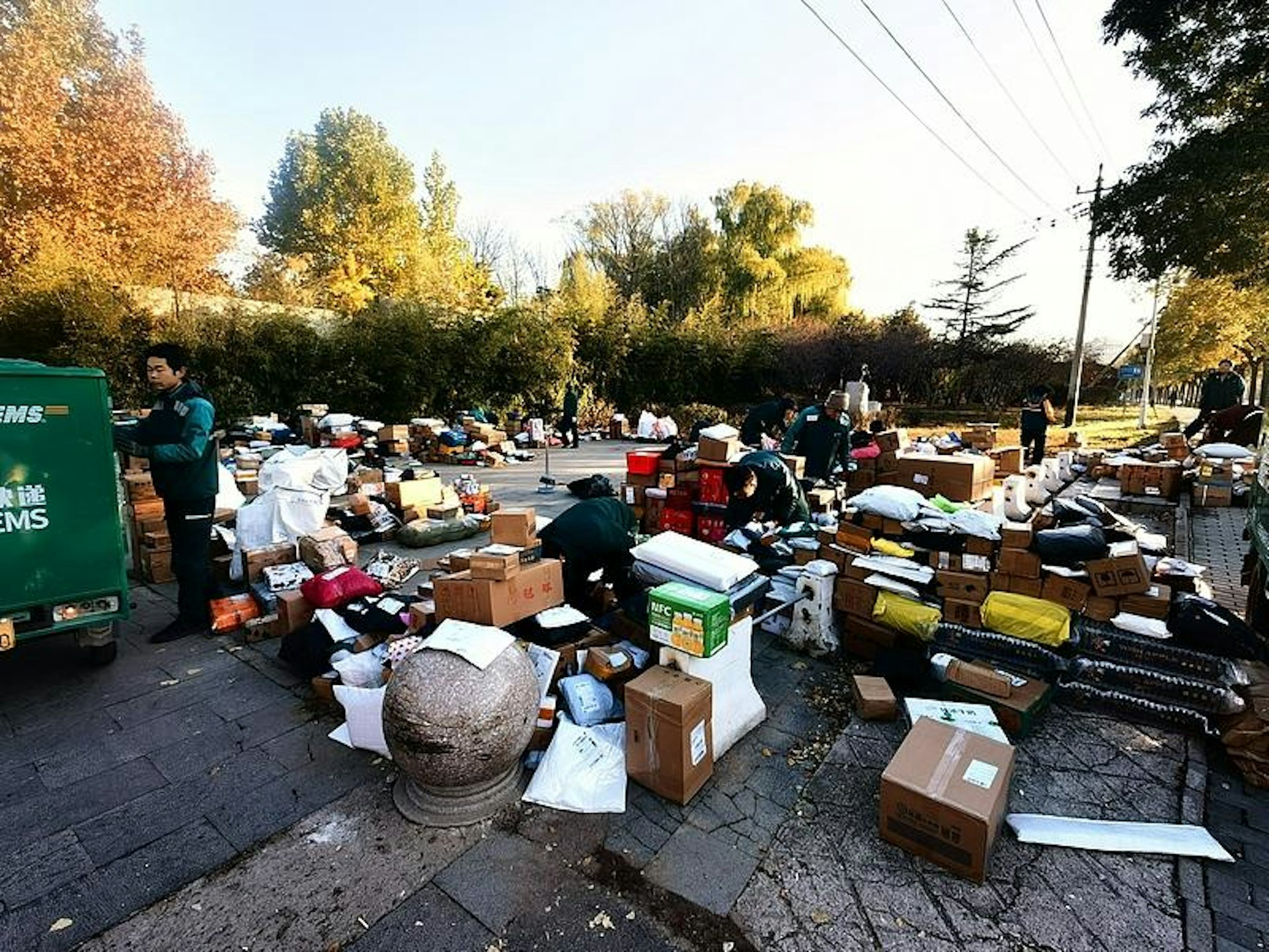 2025年11月11日,北京海淀區,每年一度的「雙十一」大戰,京城街頭到貨的快件堆積如山,等待派送中。(CFP)