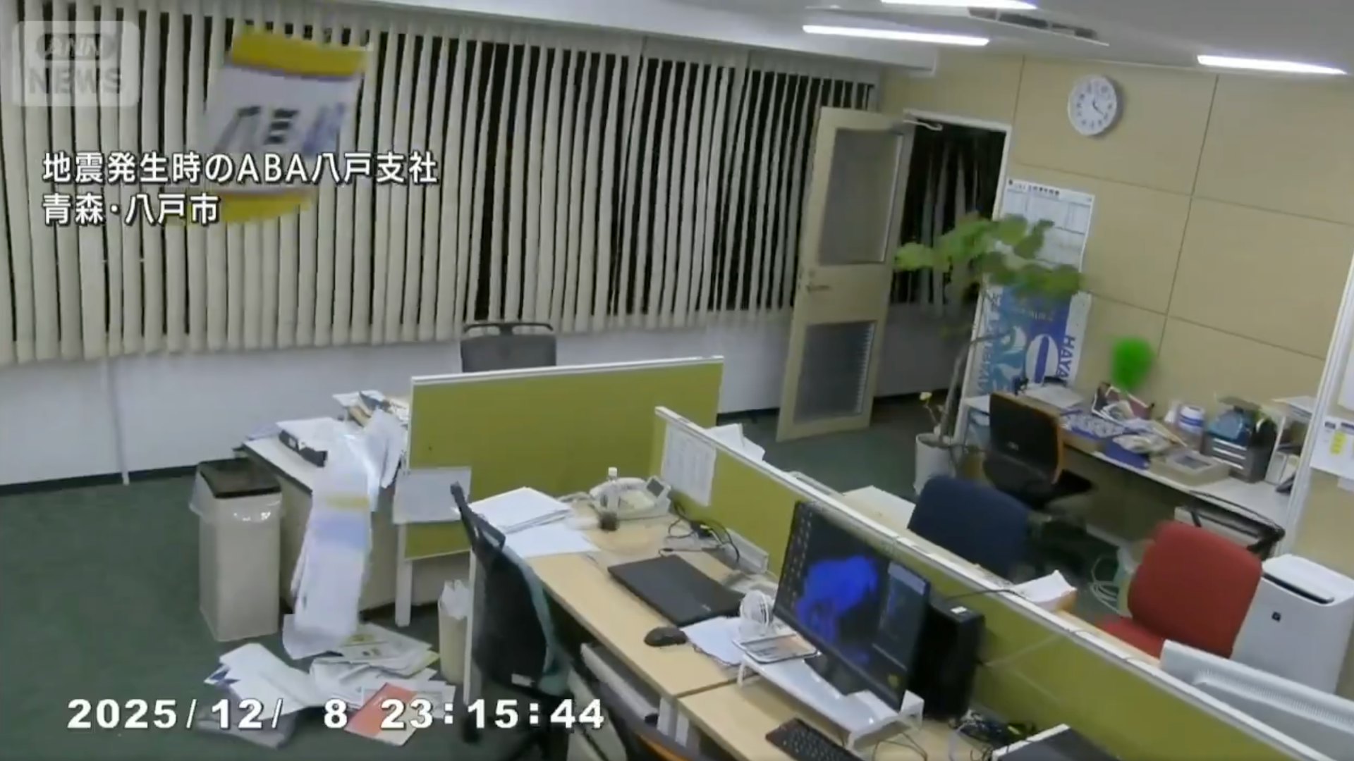 2025年12月8日,日本青森縣外海晚上發生7.5級地震,首相高市早苗表示,目前已收到30人受傷的報告。從網上一段影片可見,位於青森縣八戶市的青森朝日廣播辦公室感受到地震的強度,劇烈搖晃持續約一分鐘,導致辦公室內的文件散落一地,大樓的牆壁和窗戶皆出現劇烈震動。(X@BABYLONBU5TER)