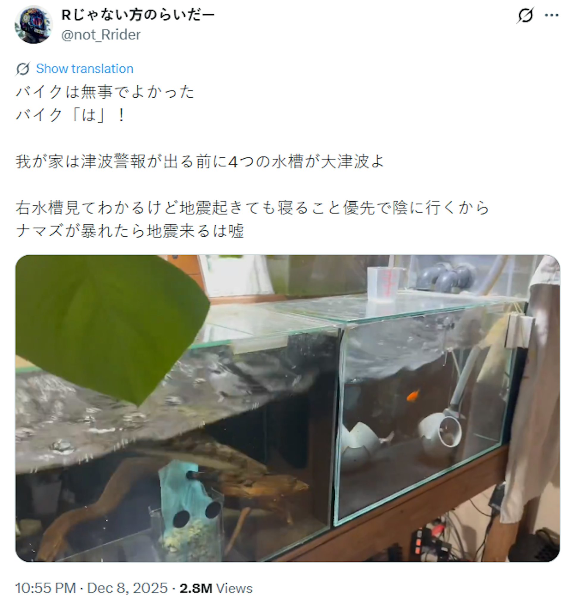 鯰魚在日本大地震時沒有異常暴動行為 日本昨深夜發生大地震後,氣象廳針對北海道、東北地區發布海嘯注意警報。網友「Rじゃない方のらいだー」在社群平台「X」發文保平安之餘,還分享家中飼養的鯰魚在發生地震時,僅換個地方繼續睡覺,並沒有出現任何「暴動」行為。 從畫面上可見,魚缸中的水因地震劇烈晃動,不斷溢出,而魚缸中的魚隨着波浪搖晃,僅移動位置,但無異常反應。