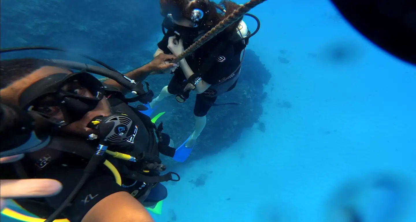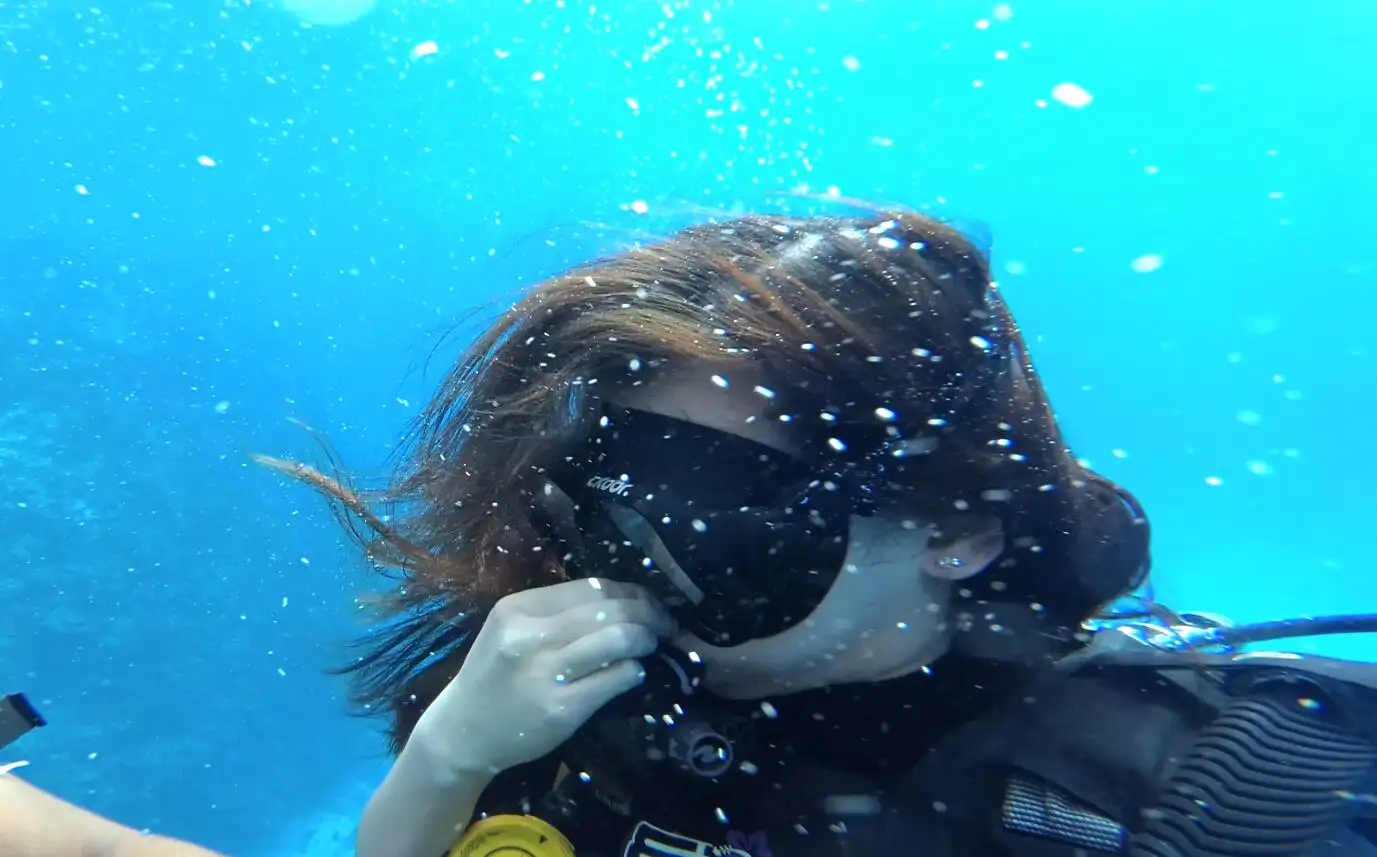 我和媳妇都是医学生出身的,所以虽然有些词汇并不完全清楚,但还是一次性的就完成了基本的练习,直接出海了。教练让她321后仰,结果氧气瓶加铅块太重,媳妇直接掉进了海里,不过有惊无险,这次下去我带了小蚁相机,不BB了,上图。