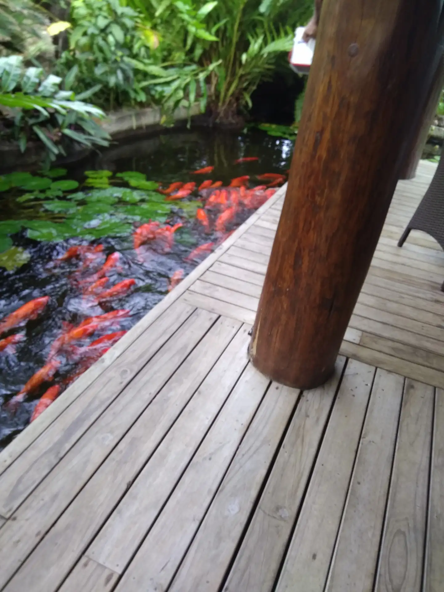 图:餐厅旁的荷花池里有好多锦鲤,怎么看都像是国内的土豪山庄。