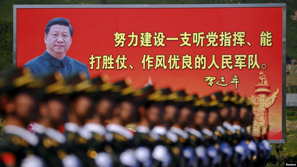 解放军士兵列队在中国领导人习近平画像前走过。 (2015年8月22日)  |