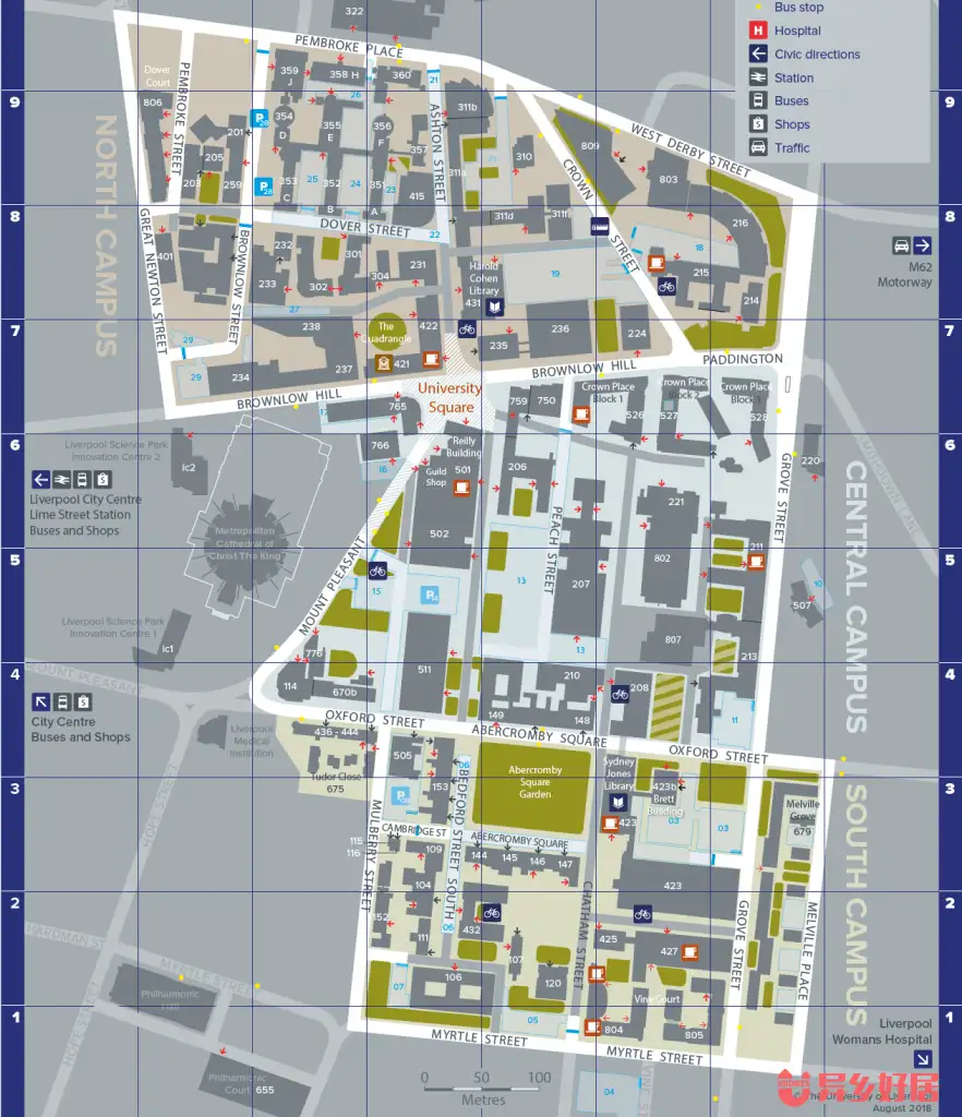 最有名的紅磚樓the Victoria Building是利物浦大學的象徵,位於圖中央421。