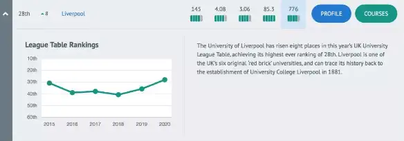 和REF英國研究卓越框架等,並為留英學生選校權威參考。)排名中利物浦大學位列全英第28位,較去年上升8位。