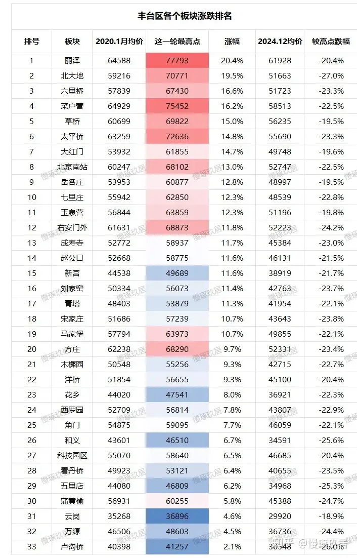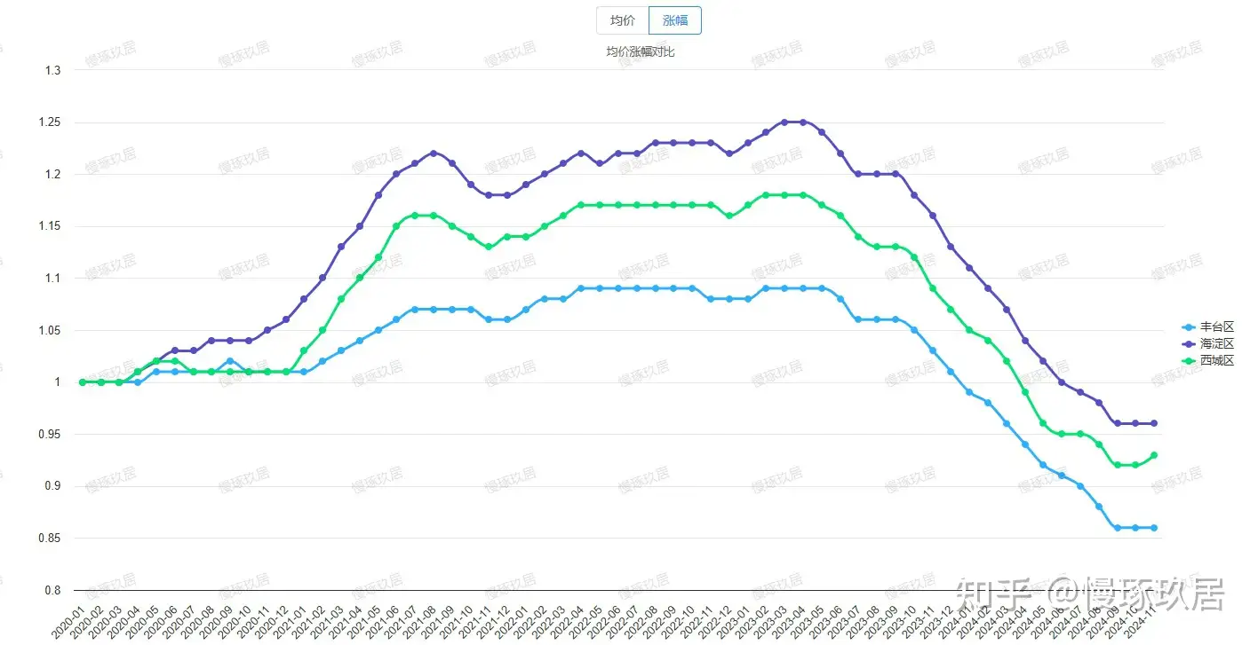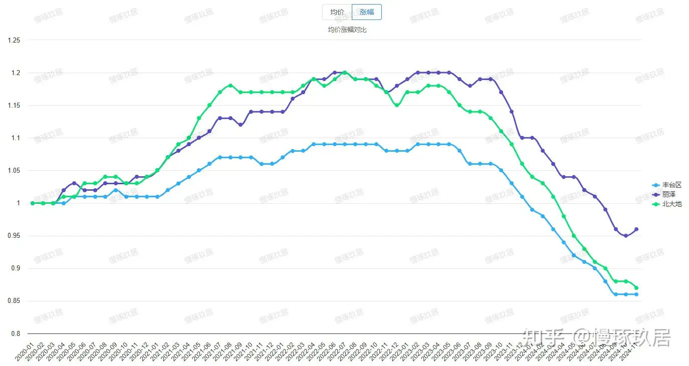 而在2023-2024年这一波下跌趋势中,丰台的跌幅却是最多的,现在只有2020年初价格水平的86%。
