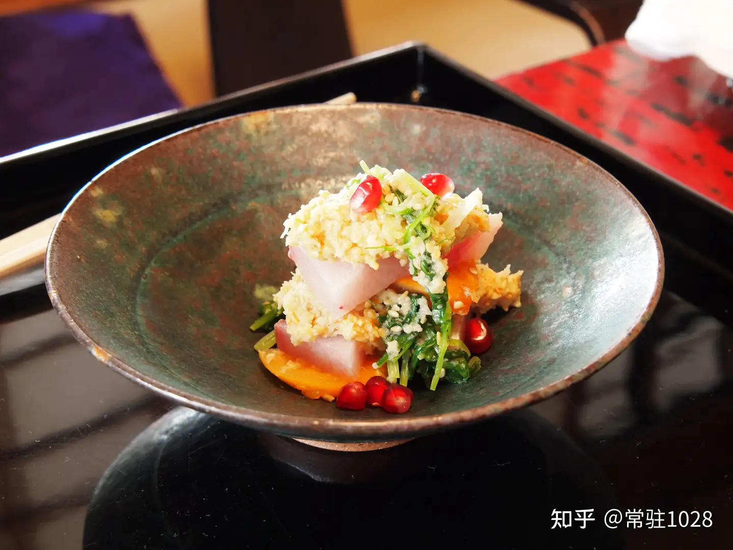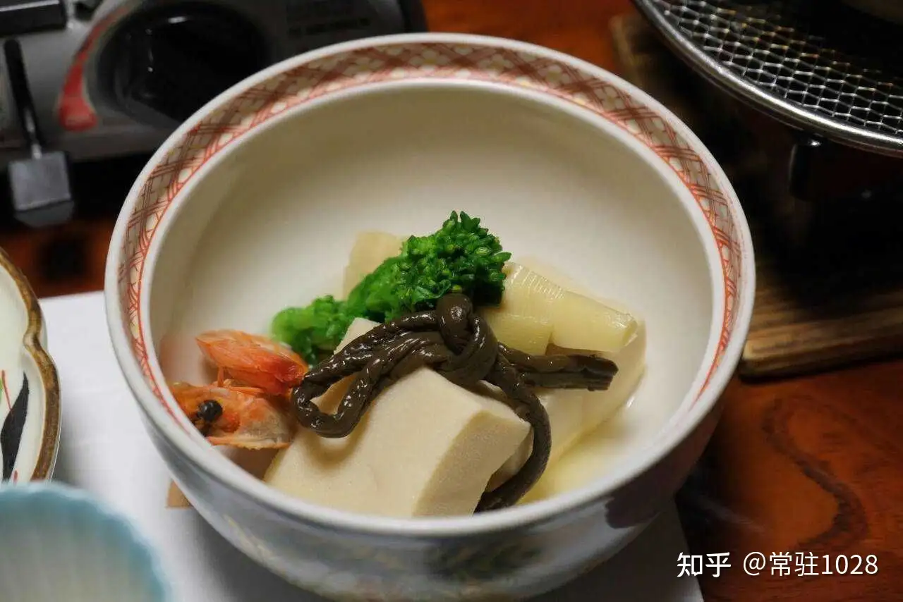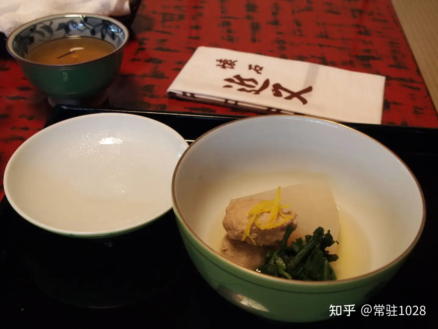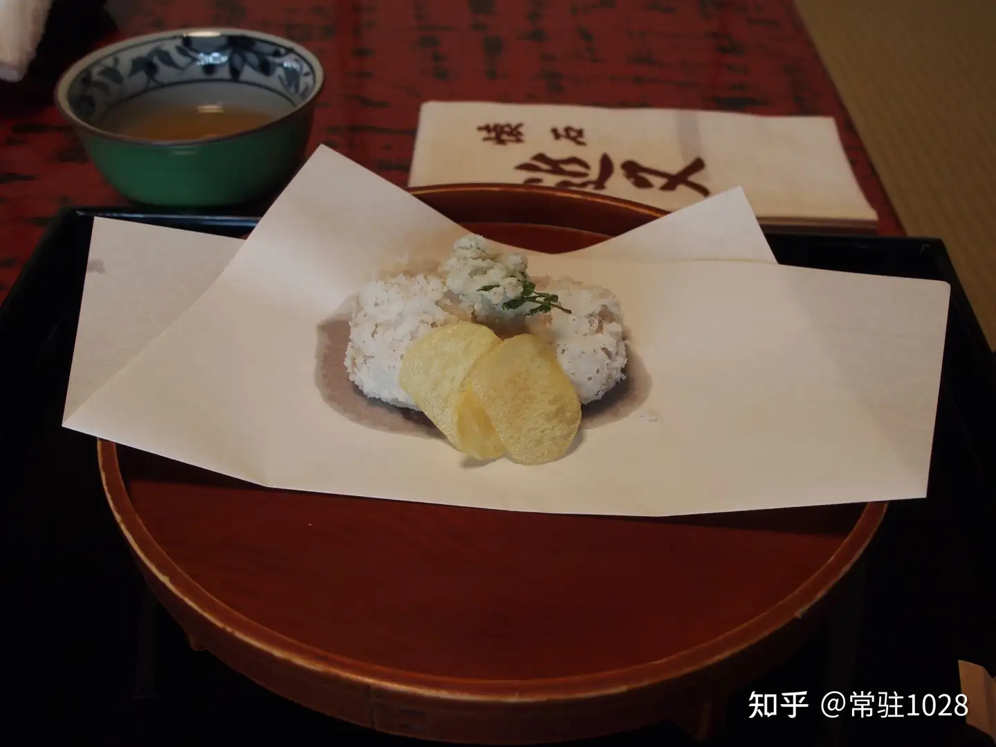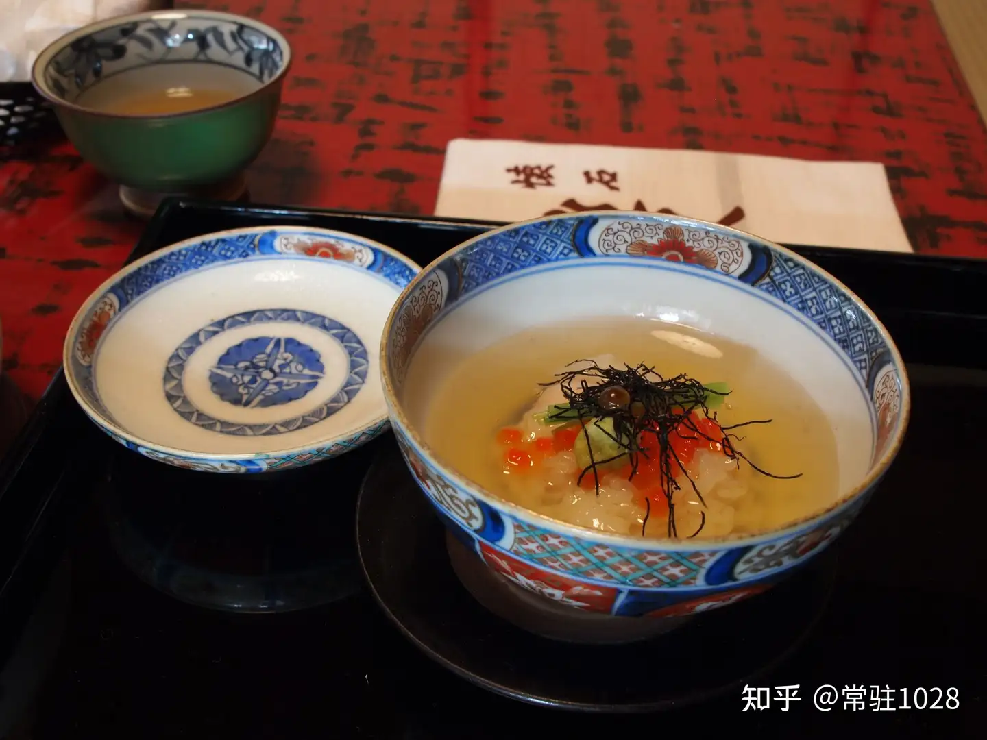 。最早的怀石料理只有三菜一汤,为的是让客人在品茶前先垫垫肚子。后来才逐渐变成有很多道菜了。现在吃完一套怀石料理,应该感觉刚刚好。要是吃撑了倒不好了。下面是我在京都吃的一套比较便宜的怀石。
