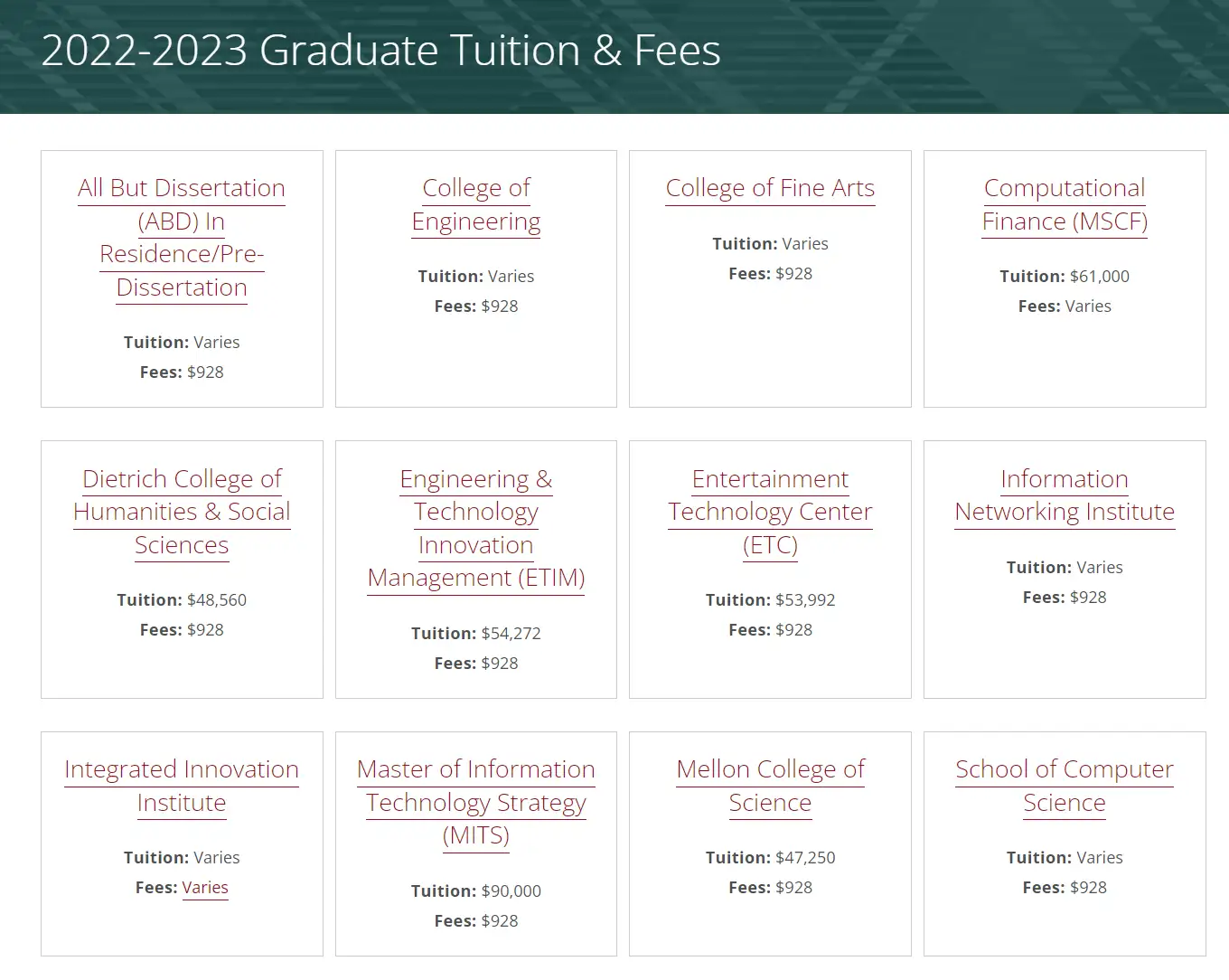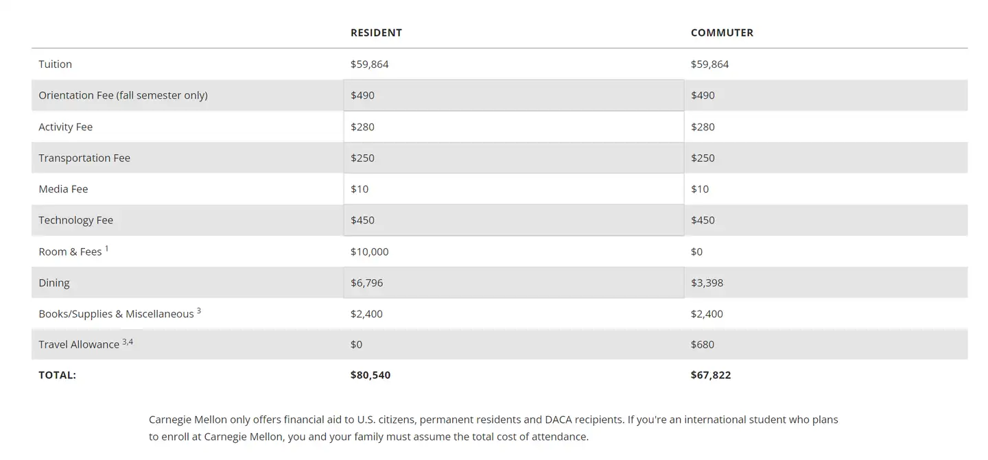 3、留学费用及奖学金如果说美国大学学费比较贵的有哪些,CMU一定榜上有名!CMU的官网上标出的本科学费是59864美元,并且CMU不会向国际学生提供经济援助。
