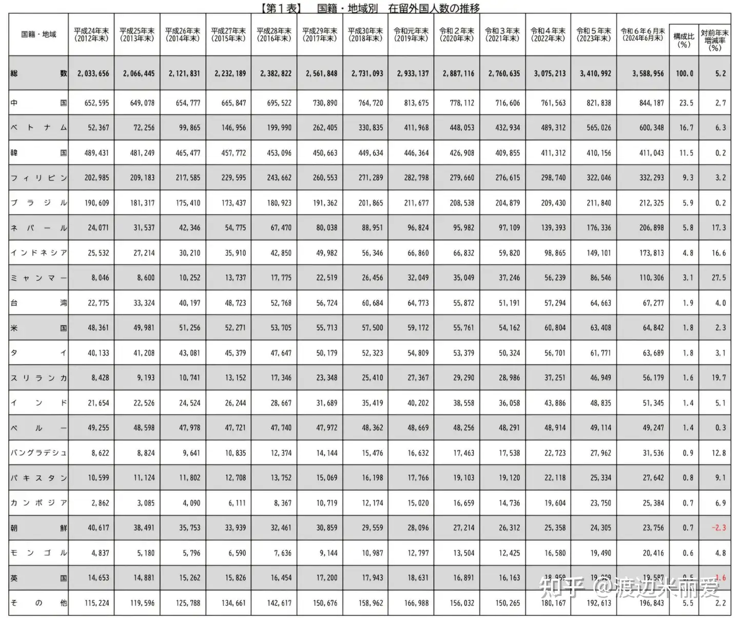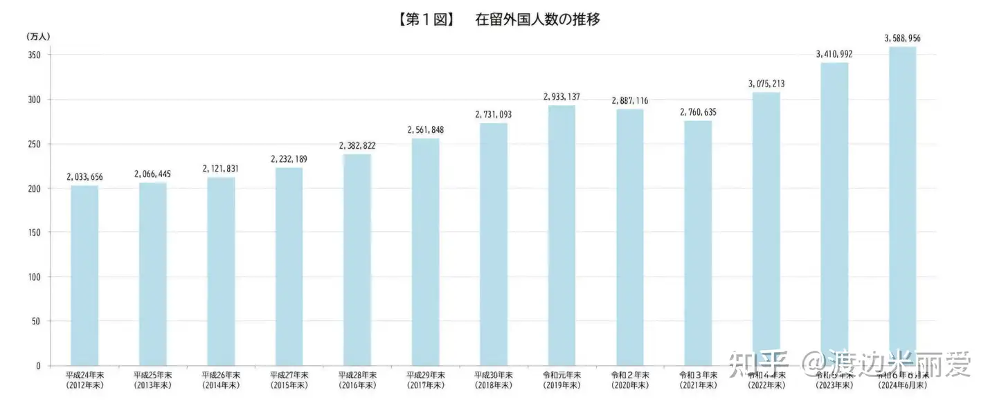 从2012年底的203万迅速攀升至2024年6月底的359万,在不到12年的时间里外国人口增加了156万,这数字超过了神户市的总人口,同时外国人数量占比也从2012年底的1.6%提升至2024年6月底的2.9%