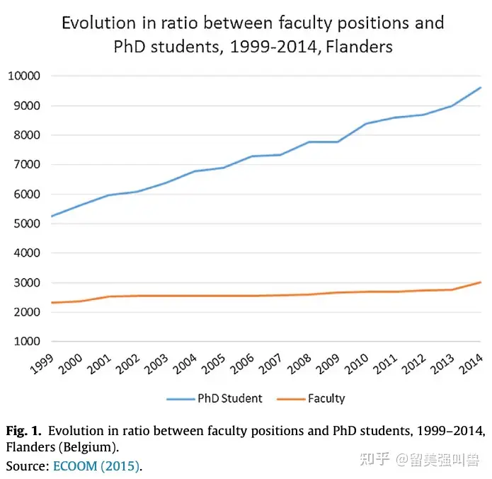 Fig. 1. Evolution in ratio between faculty positions and PhD students, 1999–2014, Flanders (Belgium).Similarities and differences between European and North American (U.S.) PhD programs.