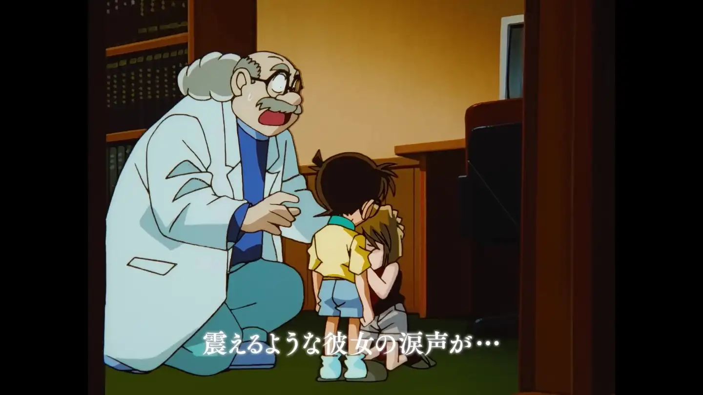 最后又绕回到小柯,TV129《来自黑衣组织的女子 大学教授杀人事件》。这个安排其实很有意思。从时间上来说,这个情节应该发生在上面说的第一幕之后、接下来三幕之前;从情绪上来说,这是相当悲伤、低沉、气沮的,也跟上面连续三幕与少侦的温情画面判然有别。为什么选这一幕并排在这里?也许是因为这是小哀对小柯打开心防的起始,从这一点上来说和前面的三幕在性质上有相通之处。另外,或许也是为了和第一幕形成某种首尾呼应的效果。