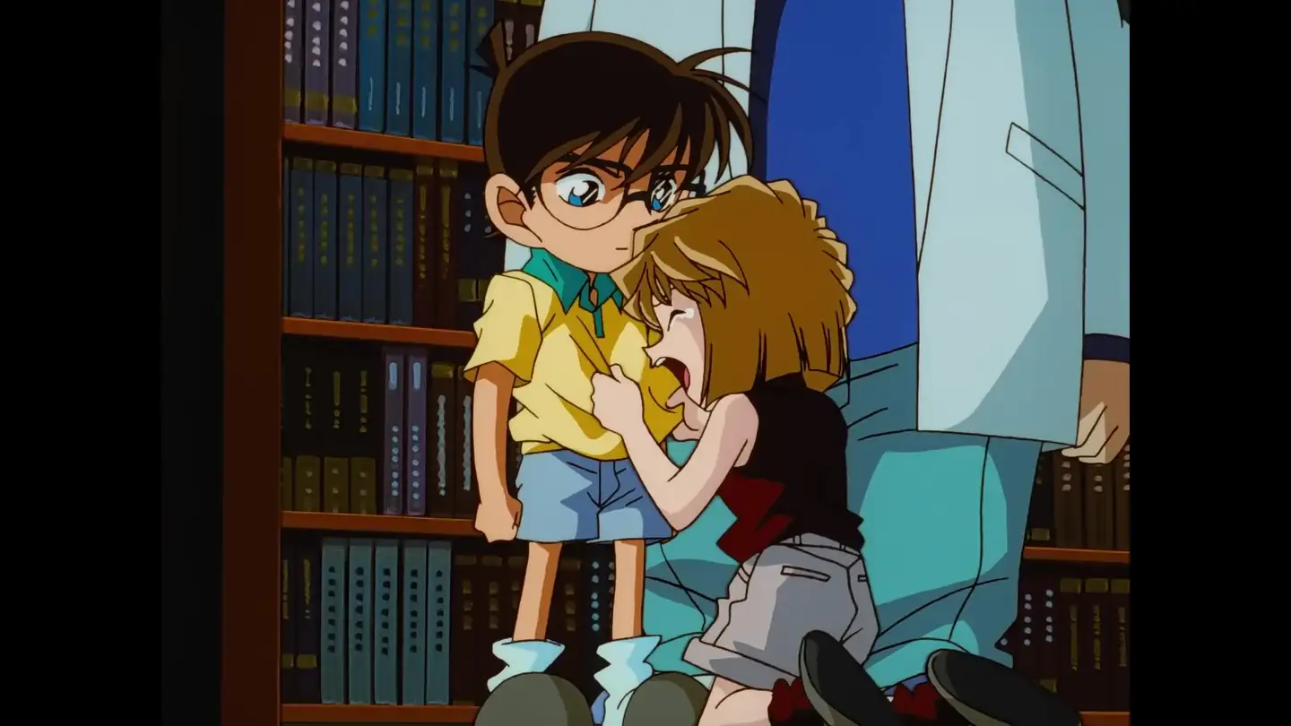 这里首先可以和上面的第一幕柯哀互动作对比,纯就表情也就是笑容来说,我认为,这两幕在新ED里的描绘没有实质差别。问题是,柯哀那一幕是小哀存心吓唬柯南,她的笑理应表现某种程度的恶意、诡谲、自得,不可能像跟步美互动时这样的恬静淡然、温柔和善。显然,由此反观,更可知前面说到的柯哀在ED里呈现的并不那么好,而这一幕步哀互动制作组把握的就是合适的。