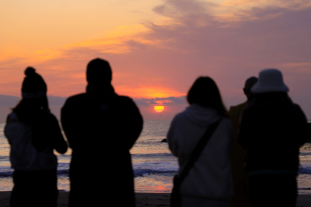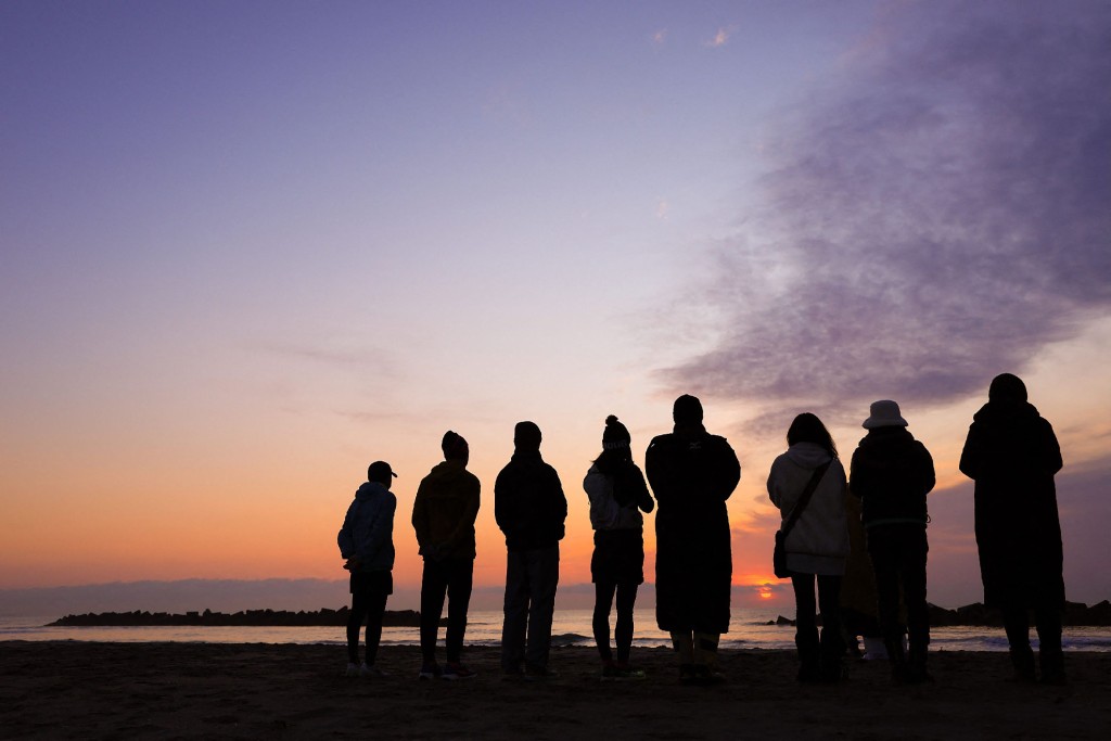 周二清晨有仙台民眾在海邊舉行祈禱活動。法新社