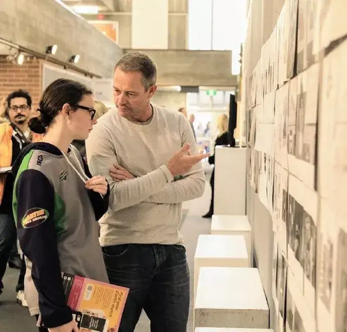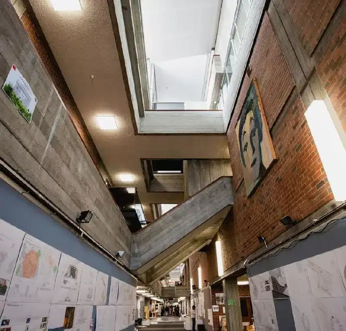 科廷大学把教学楼中庭空间变成了一个画廊,同学们可以把自己的作品展示在那里。露天楼梯有点像朱丽叶的阳台在那里你可以俯看下面的全部活动。