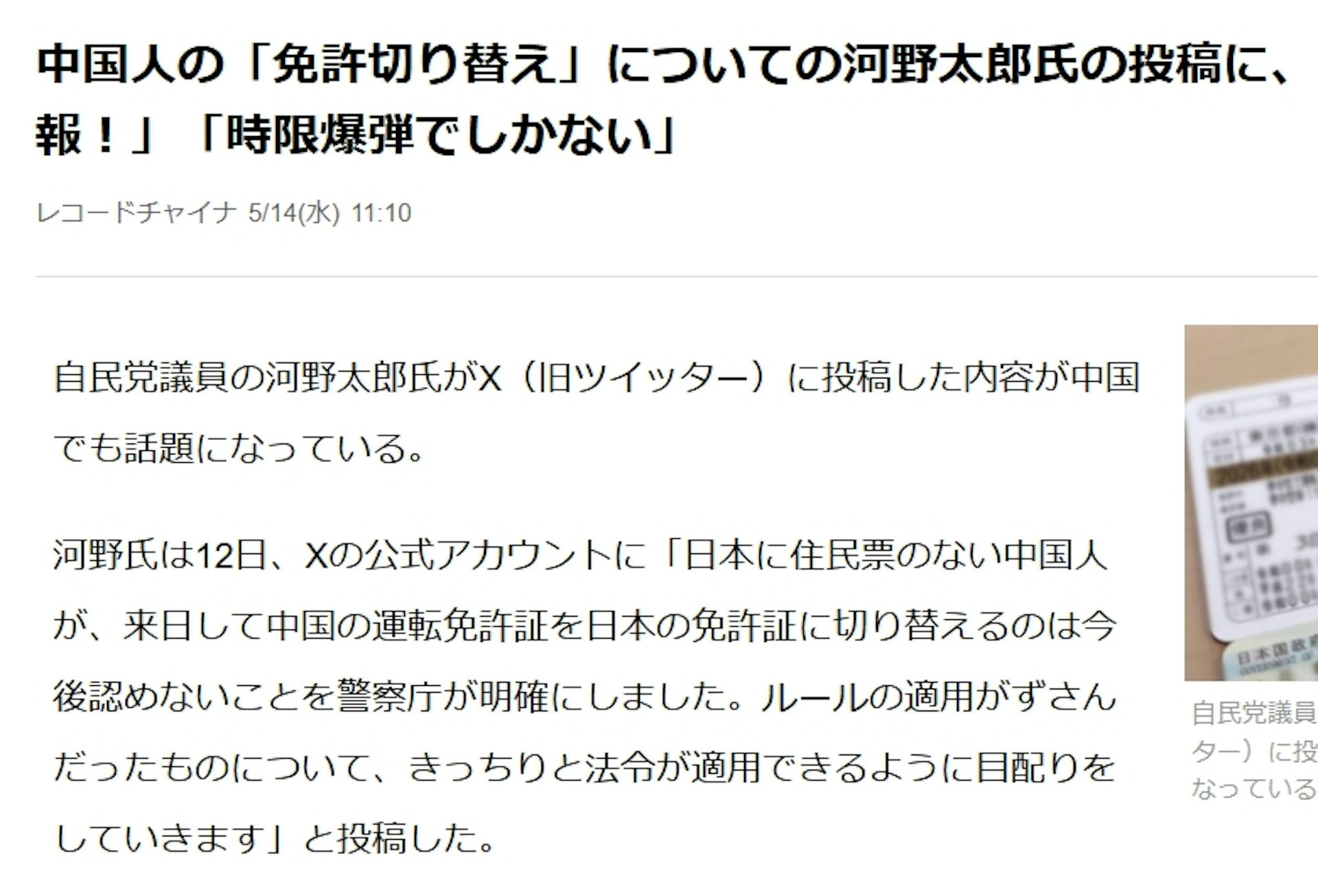 最近,日本前數位擔任大臣河野太郎的社交媒體發言,引發了中日兩國網友的廣泛討論。他在5月12日深夜表示:將禁止沒有日本住民票的中國人,把中國駕照(駕駛執照)換成日本駕照。這意味著一個存在已久的「制度漏洞」,可能真的要被堵住了。