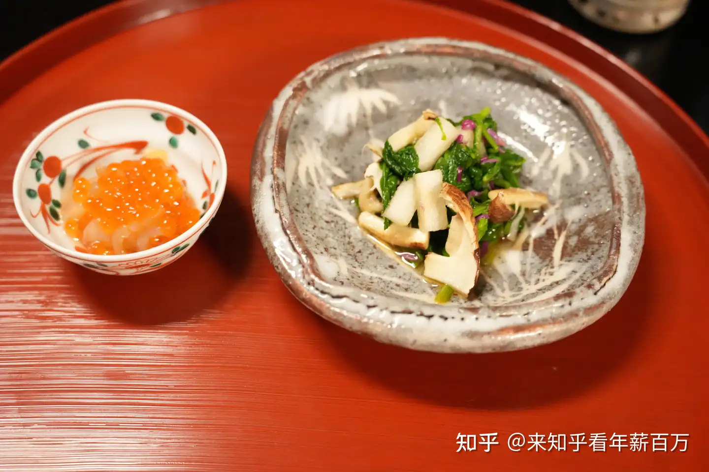 前菜(先付)鲑鱼子甜虾和凉拌松茸